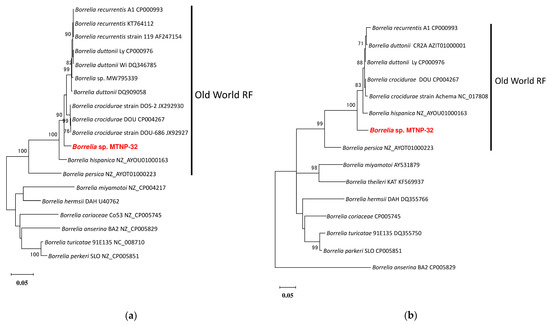Phylogenetic trees of Borrelia sp. from MTNP-32. The analyses were performed by the ML method with the Kimura-2 parameter. Bootstrap values > 70% are based on 1000 replications and are shown beside the branches. (a) The tree based on 840 bp of the glpQ sequence; (b) the tree based on 388 bp of the hpt sequence. The sample in this study is in bold and red.