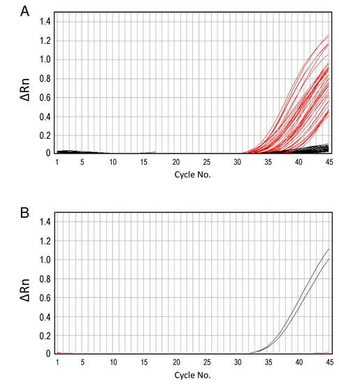 Detection of Borrelia DNA from tick specimens by real-time PCR. PCR positive by NWB_VIC_1794 (red line) and OWB_FAM_1795 (black line) probes were shown in (A,B), respectively. Each tick specimen was examined in duplicate in this study.