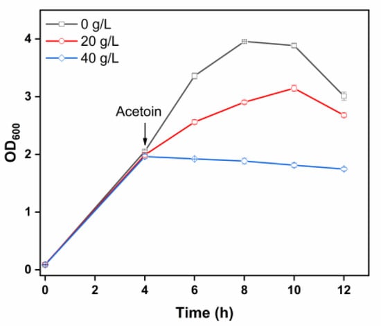 Effect of acetoin on the cell growth of strain GXASR-48p in LB medium. Error bars represent the standard deviation (n = 3). Due to small variability, some error bars hidden behind the symbols are not apparent.