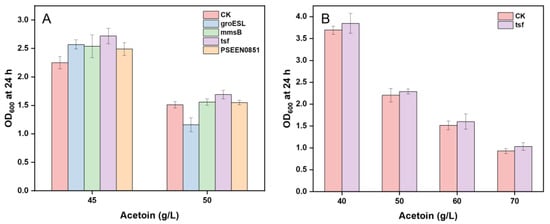 (A) Screening of putative acetoin-tolerant genes with stress of 45 or 50 g/L acetoin in GXASR-48 by overexpressing individually in plasmid pTrc99A, CK: GXASR-48-CK, groESL: GXASR-48-groESL, mmsB: GXASR-48-mmsB, tsf: GXASR-48-tsf, PSEEN0851: GXASR-48-PSEEN0851. (B) Further identifying the acetoin resistance of GXASR-48-tsf with a gradient concentration of acetoin. Error bars represent the standard deviation (n = 3).