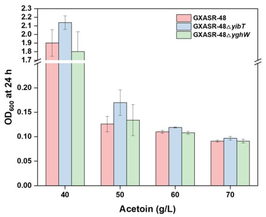 The effect of knocking-out of yibT or yghW individually in GXASR-48 on acetoin resistance. The concentration of exogenously added acetoin varied from 40 to 70 g/L. Error bars represent the standard deviation (n = 3).