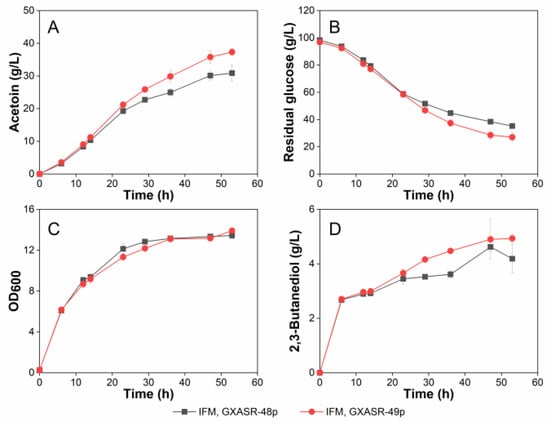 Batch fermentation using strains GXASR-48p and GXASR-49p in 250 mL shake flasks containing 40 mL of IFM. (A) Acetoin production; (B) glucose consumption; (C) time course profile of cell growth; (D) 2,3-Butanediol production. Error bars represent the standard deviation (n = 3). Due to small variability, some error bars hidden behind the symbols are not apparent.
