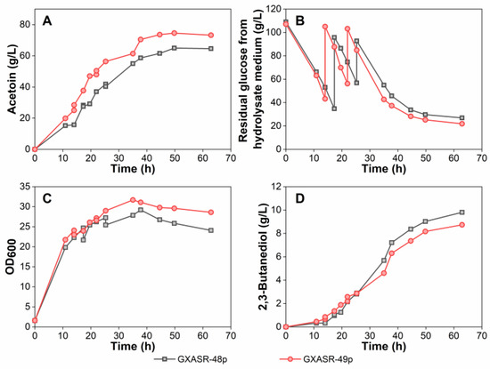 Fed-batch fermentation in a 3-L fermenter containing 1.5 L of hydrolysate medium using strains GXASR-48p and GXASR-49p. (A) Acetoin production; (B) glucose consumption; (C) time course profile of cell growth; (D) 2,3-Butanediol production.