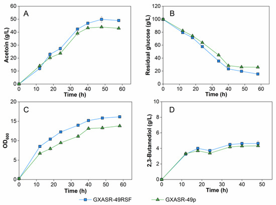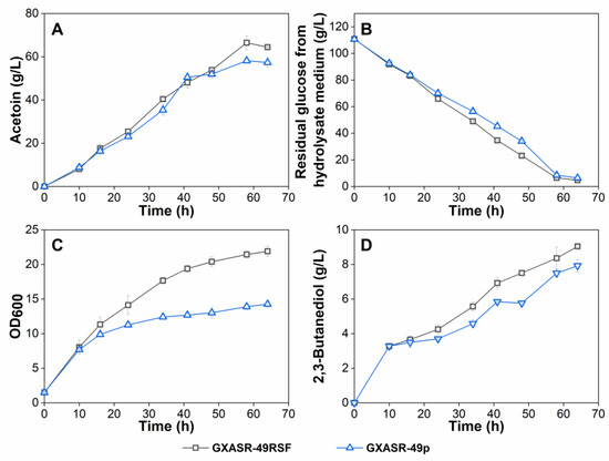 Batch fermentation using strains GXASR-49RSF and GXASR-49p in 500 mL shake flasks containing 80 mL of hydrolysate medium. (A) Time course profile of cell growth; (B) glucose consumption; (C) acetoin production; (D) 2,3-Butanediol production during fermentation. Error bars represent the standard deviation (n = 3). Due to small variability, some error bars hidden behind the symbols are not apparent.