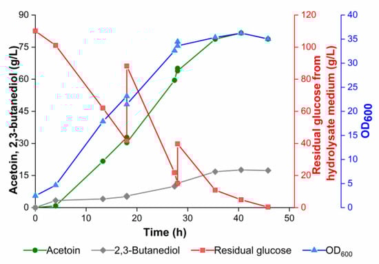 Fed-batch fermentation of acetoin in a 3-L fermenter containing 1.5 L of hydrolysate medium using strain GXASR-49RSF.