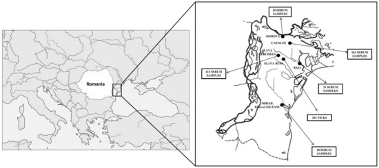 Between 2019 and 2021, a total of 342 blood samples were collected from small ruminants from six different villages in a rural area within Tulcea County (Danube Delta region) in the same location as the of ticks (Figure 1). Details regarding the number of serum samples and the collection sites are presented in Table 1. These sera were obtained with the approval of the animal owners, under the control of the local veterinary services from Tulcea County. For additional processing, all samples were shipped to the Institut Pasteur in Paris, France.