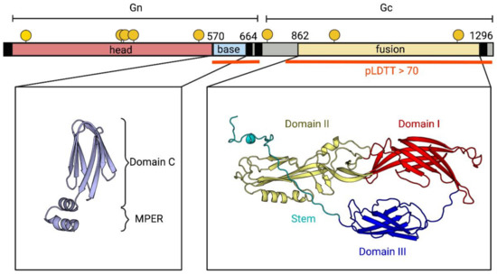 Organization of the glycoprotein. The upper panel shows a diagram of the glycoprotein precursor colored according to domains (GnH in red, GnB in cyan, and the class-II fusion protein in yellow). The boundaries of each domain are indicated on the diagram. The locations of N-glycosylation sites are indicated with a yellow circle on top of the diagram. The two regions that generate a reliable alphafold prediction (pLDTT > 70) are indicated with a red line below the diagram. The panels below show the alphafold predictions for these two regions colored according to domains, as indicated.