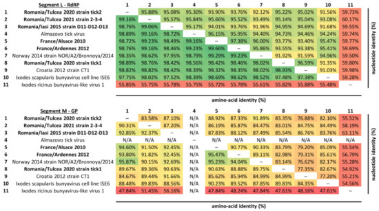 Amino-acid and nucleotide identity matrix of Bronnoya virus RNA-dependent RNA polymerase (upper panel) and glycoprotein (lower panel). Matrices were colored according to the identity scale: the lowest identities are represented in red and the highest in green. Sequences are ordered by similarity in the RdRP protein. “N/A” indicates that the glycoprotein sequence of the Almazovo tick virus is not available.