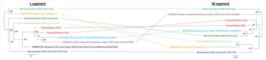 Interestingly, phylogenetic reconstruction of the evolutionary history of BroBV L and M segments revealed that the different strains of Bronnoya virus circulating in the same area fall into two sub-clades, as was observed for Romania/Tulcea tick1 and tick2 isolates, suggesting that different viruses are co-circulating in the same tick populations. Of note, the different isolates of BroBV did not cluster similarly according to the segment, further demonstrating that reassortments between Bronnoya viruses circulating in the same area could have occurred during the evolution of these viruses (Figure 4). Neither apparent clustering according to the geographical area nor according to the tick species was observed, as Ixodes scapularis-related Bronnoya virus identified in a tick cell line falls within a clade encompassing several Ixodes ricinus-related BroBVs.