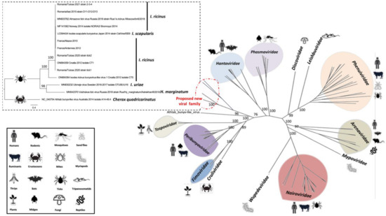 - Bratuleanu, B.E.; Temmam, S.; Chretien, D.; Regnault, B.; Perot, P.; Bouchier, C.; Bigot, T.; Savuta, G.; Eloit, M. The virome of Rhipicephalus, Dermacentor and Haemaphysalis ticks from Eastern Romania includes novel viruses with potential relevance for public health. Transbound. Emerg. Dis. 2022, 69, 1387–1403. [Google Scholar] [CrossRef]
