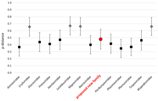 Mean evolutionary p-distances between Bunyavirales families. Families for which one sequence was used in the analysis are represented by a gray diamond, and families for which >1 sequences were included are represented by a black square. The proposed new family is highlighted by a red circle.