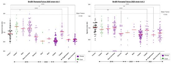 Results of the Luciferase immunoprecipitation (LIPS) small-ruminant screening against Romanian BroBV. French sheep sera (black) served as likely non-exposed negative controls. Sheep (purple) and goat (green) sera were tested for antibody responses against the BroBV Romania/Tulcea 2020 tick1 (left panel) and BroBV Romania/Tulcea 2020 tick2 strains (right panel). The ANOVA non-parametric Kruskal–Wallis test was conducted to compare each sub-population to the reference French population. Only significant differences are presented and labeled as *, **, and **** according to the level of significance of the differences.