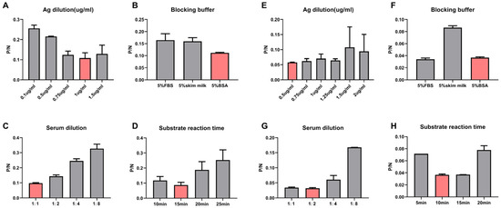The optimal coating concentration of Bc48 protein for the detection of B. caballi was 0.5 µg/mL (Figure 1E) and the most suitable blocking buffer was 5% BSA (Figure 1F). The optimal dilution of the equine serum sample to be tested was found to be 1:2 (Figure 1G). The optimal colorimetric reaction time was 10 min since the P/N value at this time was the minimum (Figure 1H).