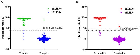Different dilutions of T. equi-positive serums were used to determine the analytical sensitivity of the novel cELISA. The results showed that the PI was greater than 40% when the T. equi-positive serum was diluted 1:128 and was less than 40% when the T. equi-positive serum was diluted 1:256 (Figure 4A). Similarly, the analytical sensitivity of the novel cELISA for B. caballi was determined using different dilutions of B. caballi-positive serums. The results showed that the PI was greater than 40% when the B. caballi-positive serum was diluted 1:64 and was less than 40% when the B. caballi-positive serum was diluted 1:128 (Figure 4B). So, the data indicated the analytical sensitivity of the novel cELISA for T. equi and B. caballi were 1:128 and 1:64, respectively. Overall, the developed novel cELISA methods exhibit good sensitivity and have promise as candidates for a commercial kit.
