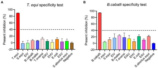 Analysis of the specificity of the novel cELISA. Cross-reaction of the novel cELISA to T. equi (A) or B. caballi (B). Sera positive for other pathogens, including EIAV, EAV, EHV-4, EIV, B. caballi, B. mallei, T. equi T. evansi, E. coli, S. equi, S. abortus equi, and a negative sample, were tested with the novel cELISA at the same time.