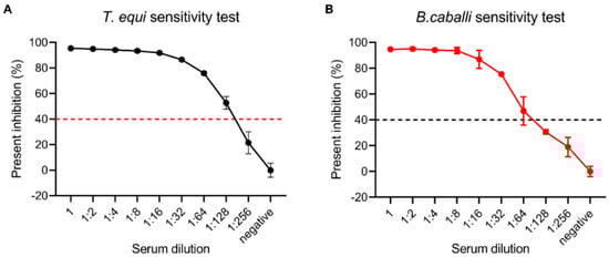 Analysis of the sensitivity of the novel cELISA. Serial two-fold dilutions of positive sera and a negative serum sample were tested with the novel cELISA, and percent inhibition was recorded. (A) Performance of the novel cELISA when detecting antibodies against T. equi in T. equi-positive sera at 0:1, 1:2, 1:4, 1:8, 1:16, 1:32, 1:64, 1:128, and 1:256 dilutions, and a negative T. equi serum sample. (B) Performance of the novel cELISA when detecting antibodies against B. caballi in B. caballi-positive sera at 0:1, 1:2, 1:4, 1:8, 1:16, 1:32, 1:64, 1:128, and 1:256 dilutions, and a negative B. caballi serum sample.