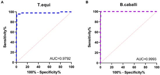 To evaluate the performance of this novel cELISA assay, a total of 200 serum samples were tested using the novel cELISA and a commercially available cELISA kit. All samples were tested with the novel cELISA, as well as the commercially available cELISA kit, and the PI value of each sample was determined. We performed receiver operating characteristic (ROC) curve analysis as a statistical tool for the diagnostic evaluation of the novel cELISA in surveillance samples, where the area under the ROC curve (AUC) was employed to assess the accuracy of the novel cELISA assays (an AUC of 1 indicates perfect discriminatory value; an AUC of 0.5 or less indicates no discriminatory value). Compared with the commercial cELISA method, the AUCs of the novel cELISA assay were 0.979 for T. equi and 0.999 for B. caballi (p < 0.001) (Figure 5A,B), and the diagnostic sensitivity and specificity of our novel cELISA assay were 91.49% (43/47) and 99.35% (152/153) for T. equi, and 88% (22/25) and 99.43% (174/175) for B. caballi (Figure 5A,B). The agreement among the assays was calculated as previously reported [24], and the coincidence rate between the novel cELISA and the commercial cELISA assays was 97.5% for T. equi and 98% for B. caballi.