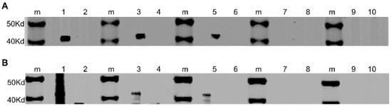 Determination of the optimum dilution of the test sera for western blot immunoassay. Lines: m, maker; 1, 1:50 (positive sera); 2, 1:50 (negative sera); 3, 1:100 (positive sera); 4, 1:100 (negative sera); 5, 1:200 (positive sera); 6, 1:200 (negative sera); 7, 1:400 (positive sera); 8, 1:400 (negative sera); 9, 1:800 (positive sera); 10, 1:800 (negative sera). (A) The determination of the optimum dilution of the test sera for the western blot assay for T. equi detection. (B) The determination of the optimum dilution of the test sera for the western blot assay for B. caballi detection.
