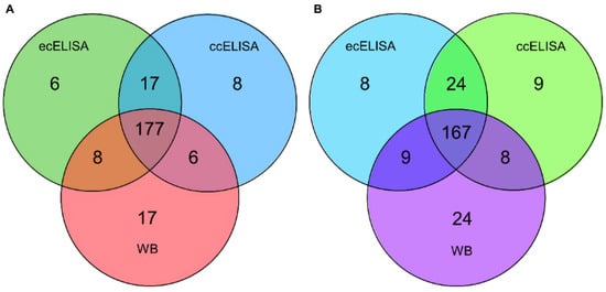 Venn diagram showing summary results of serological detection methods (newly established cELISA (ecELISA), commercial cELISA (ccELISA), and western blot (WB) assays) for serum samples from equids. A total of 208 serum samples collected in Inner Mongolia, China in 2022 were included in the comparison. (A) Venn diagrams were used to compare the performance of the different assays in detecting antibodies against T. equi. (B) Venn diagrams were used to compare the performance of the different assays in detecting antibodies against B. caballi.