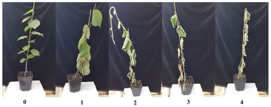 The pathogenicity test was carried out on 1-year-old plants of A. chinensis var. deliciosa ‘Hayward’ grown in 3 L pots containing a sterilised agriperlite-peat mixture. One representative isolate strain per species was used for the inoculation of five kiwifruit plants: P. vexans strain PP1, P. chamaehyphon strain PH6, P. helicoides strain CA2 and P. litorale strain R3A. The inoculum was prepared according to Prencipe et al. [10]. Briefly, each strain was grown for 7 days on a wheat and hemp mixture (100 g wheat, 50 g hemp and 170 mL of water), and used to inoculate the soil at a rate of 6 g/L per pot. Similarly, negative control plants were inoculated with a sterile seed mixture, whereas positive control plants were potted onto diseased-infected soil taken from an orchard of A. chinensis var. deliciosa ‘Hayward’ located in Saluzzo (Piedmont, north-western Italy), showing typical KVDS symptoms. Plants were kept in greenhouse at 28 ± 5 °C. In order to simulate the field capacity, 2 days post inoculation (dpi), all of the plants were submerged up to the crown level for 72 h. Based on symptoms observed, the disease severity (DS) on Actinidia plants was scored at 12 and 26 dpi using a scale of 0 to 4 (Figure 1), corresponding to: 0 = healthy plant; 1 = plant starting to wither at the basal level; 2 = plant showing withering to the upper level and basal leaves showing curling; 3 = basal leaves dried and upper leaves curling; 4 = dead plant.