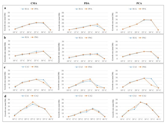 The optimal growth for P. chamaehyphon strains occurred at 25 °C on CMA, PDA and PCA, with an average radial growth of 25, 23, and 23 mm/24 h, respectively (Figure 4c). The minimum and maximum growth temperature were 10 °C and 30 °C, respectively, on all media.