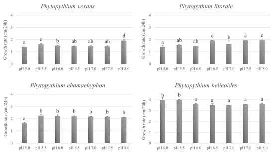 Average radial growth rate (cm/24 h) of two strains per Phytopythium species grown onto PCA media adjusted at specific pH at 25 °C for 5 days. Values are expressed as mean values ± SD (n = 6). Values followed by the same letter are not statistically different by Tukey’s test (p ≤ 0.05).