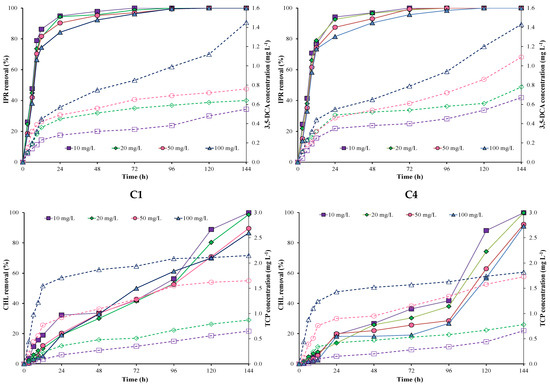 Figure 4 shows the results obtained for IPR and CHL removal, evaluating different inoculum concentrations of the immobilized bacterial consortium (5, 10, and 15% w/v) at 50 mg L−1 (each pesticide). IPR removal did not present significant differences when the inoculum concentration increased. At the end of the assay, IPR was removed entirely (Figure 4). IPR removal was characterized by T1/2 values of 11.8, 11.5, and 10.8 h for 5, 10, and 15% w/v inoculum concentration, respectively (Table 3).