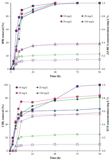 Pesticide removal (symbol filled with a continuous line) and metabolite production (empty symbol with a dotted line) when using the free bacterial consortium in a liquid medium. Iprodione (IPR) and chlorpyrifos (CHL) were added (in mixture) at initial concentrations of 10, 20, 50, and 100 mg L−1 each.