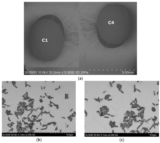Under these considerations, in our study, we performed the immobilization of bacterial strains individually for each strain, due to their different specific growth rates (µ max), and to ensure that each bacterial strain would have one equal biomass concentration and a homogeneous distribution inside the alginate bead. In this way, we promoted a high density of cells in the support [48,49]. Additionally, we considered the specific growth rates of 0.15 and 0.29 h−1 for the C1 and C4 strains, respectively, where the C4 strain grows faster than the C1 strain and, consequently, can achieve a higher biomass concentration over time. Therefore, we immobilized these strains separately to avoid unequal growth inside the alginate bead.