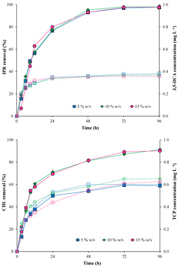 In addition, 3,5-DCA and TCP metabolites were detected during all evaluated times. For the 3,5-DCA metabolite, the concentration remained stable from 24 h with a maximum value of 0.38 mg L−1 at the end of the assay. For the TCP metabolite, the maximum concentrations were obtained at the end of the assay with values of 0.60, 0.65, and 0.63 mg L−1 for 5, 10, and 15% w/v inoculum concentrations, respectively.