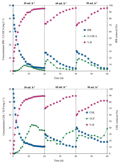 The performance of the PBR in pesticide-containing wastewater treatment depends on many factors, such as flow rate, pesticide concentration, packing material, and bed dimensions [50]. Additionally, the PBR’s operation is simple, offers a high yield, and can be easily scaled up from a laboratory-scale procedure [26]. In this study, the performance of a PBR in continuous mode was evaluated based on the removal efficiency of IPR and CHL at a 50 mg L−1 concentration each (in mixture) and at different inlet flow rates (30, 60, and 90 mL h−1) over a period of 60 days. The bacterial consortium immobilized in alginate beads at an inoculum concentration of 15% (w/v) was effective in the treatment of pesticide-containing wastewater contaminated with a mixture of IPR and CHL. The biodegradation of CHL by bacteria in a PBR was studied previously by Yadav et al. [51] who investigated the biodegradation of CHL via Pseudomonas sp. in both batch and continuous modes using bioreactors packed with polyurethane foam pieces. The authors found that the bioreactor was sensitive to flow rate fluctuations but able to recover its performance quickly. However, TCP accumulation affected the bioreactor performance. We obtained similar results showing unstable behavior in terms of TCP concentration with a tendency to accumulate. The initially higher TCP accumulation levels during the first few days of the experiment could be attributed to the slow acclimation of bacterial strains to TCP [52]. However, after the initial acclimation, the bacterial strains also started degrading TCP because a decreasing concentration was observed. Huang et al. [53] reported that TCP has antibacterial properties and an inhibitory effect on microbial communities. Therefore, the gradual accumulation of TCP could inhibit bacterial activity and, consequently, affect bioreactor performance due to the high toxicity, persistence, and water solubility of TCP [51,54]. Such toxic effects of TCP could be attributed to the release of chlorine atoms from TCP during the degradation process adversely affecting the growth rates of microorganisms, which have used TCP as a source of energy [41]. Nonetheless, the growth rates were observed to quickly recover, which indicates that the selected strains offered high degradation of the initial compound and its metabolites.