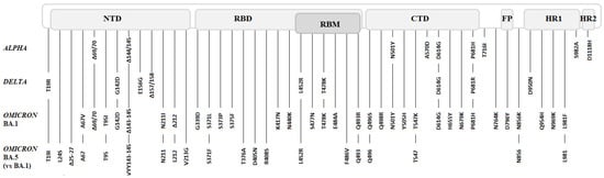 Spike mutations of Alpha, Delta, Omicron BA.1, and Omicron BA.5 variants.