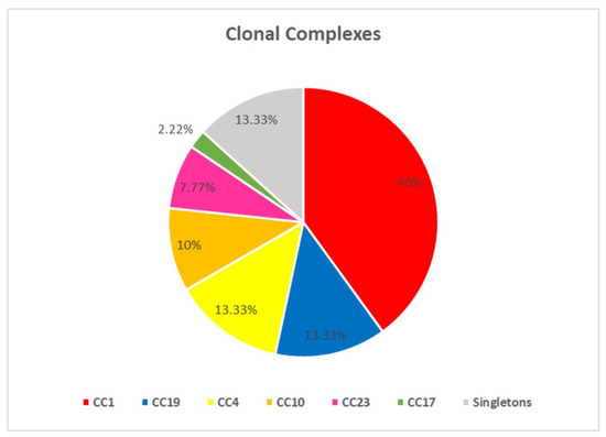The resolved STs were clustered into 6 CCs (CC1, CC4, CC12, CC17, CC19, CC23) and 6 singleton STs (ST-6, ST-24, ST-196, ST-486, ST-569, ST-934). CC1 was the most prevalent (36/90, 40%) due to a high number of isolates representing ST-1 and ST-14. This was followed by CC19 (12/90, 13.3%), CC4 (12/90, 13.3%), CC12 (9/90, 10%), CC23 (7/90, 7.7%), and finally, CC17 (2/90, 2.2%) (Figure 1). Among the singleton strains that could not be assigned to a major CC, ST-569 was the most prevalent singleton (6/90, 6.6%).
