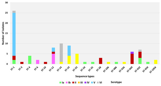 We observed an overall clustering of dominant STs into defined serotypes (Table 1, Figure 2). These included serotype V strains with ST-1 (21/28, 75%), serotype VI with ST-14 (9/11, 81.8%), serotype III with ST-19, ST-23, and ST-1954 (11/14, 78.6%), serotype Ib with ST-12 (5/7, 71.4%), serotype Ia with STs 4 and 932 (7/13, 53.8%), and serotype II with STs 28, 569, and 932 (11/16, 68.8%).