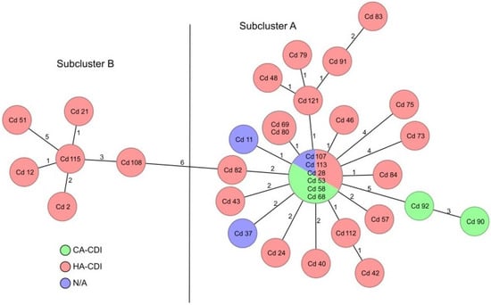 - Bletz, S.; Janezic, S.; Harmsen, D.; Rupnik, M.; Mellmann, A. Defining and Evaluating a Core Genome Multilocus Sequence Typing Scheme for Genome-Wide Typing of Clostridium difficile. J. Clin. Microbiol. 2018, 56, e01987-17. [Google Scholar] [CrossRef]