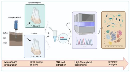 Regarding pesticides, some may be toxic to microorganisms, while others serve as a source of nutrients and energy and can be used for effective bioremediation. In this context, microorganisms capable of degrading fipronil have been isolated and studied [,,]. However, many studies aiming at finding them for biotechnological applications are limited to their isolation because more than 99% of microorganisms cannot be cultured in media [,]. Moreover, the pathway of fipronil degradation is still not fully understood. Therefore, metagenomics and metabarcoding (culture-independent methods) enable the exploration of the genetic material of these non-culturable microorganisms. This research aims to answer the hypothesis of whether the application of fipronil affects microbial diversity in microcosms. For this purpose, we have analyzed the bacterial diversity in soil microcosms under short-term exposure to fipronil using metabarcoding analysis using the 16S ribosomal RNA (rRNA) gene and compared the observed diversity with soils not exposed to fipronil.