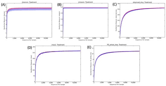 Ecological indices were used to verify whether there was a variation in diversity and species richness between the different treatments analyzed. In addition to the number of OTUs, Shannon and Simpson indices were calculated and are represented in rarefaction curves (Figure 2). All the generated rarefaction curves reached the stabilization shown by the plateau (asymptomatic values on the Y-axis).