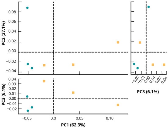 BIOM table was converted into a STAMP Profile File (spf) format using the biom_to_stamp.py script from the Microbiome Helper workflow []. Statistical Analysis of Taxonomic and Functional Profiles (STAMP) v.2.1.3 [] was used to construct the principal component analysis (PCA) plot based on the genus level. Because the sample data had heteroscedasticity and non-normal distribution, as demonstrated by the Levene test and Shapiro–Wilk test (considering p-value < 0.05 for both tests), the nonparametric White t-test [] was selected on the STAMP software to infer the differences in mean proportions between both groups. The selected method for the confidence interval was DP: bootstrap of 0.95.