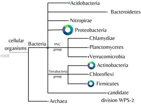 Soil samples were collected in a transition region between the Cerrado and the Atlantic Forest. In studies carried out in similar environments, a predominance of the phyla represented by Proteobacteria, Actinobacteria, and Firmicutes has been observed, with approximately 80% of the total number of representatives representing the relative abundance of these three phyla [,]. Different studies have shown the occurrence of these same phyla in the Brazilian Cerrado [,,].