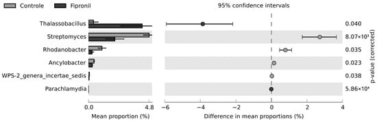 Extended bar for the difference in mean proportions between fipronil and control treatments at the genus level. Nonparametric White t-test was used with confidence interval DP: boostrap 0.95. Only results with p-value less than 0.05 are shown.