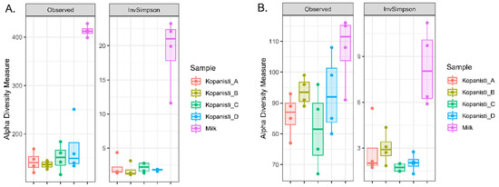 Alpha-diversity boxplots for (A) bacteria and (B) yeasts/fungi communities identified in pasteurized milk and Kopanisti A, B, C and D cheese samples. Statistically significant differences (p < 0.05) were detected between each Kopanisti type and pasteurized milk for inverse Simpson indices (both bacteria and yeasts/fungi) and for Observed index (only for bacteria). Regarding the Observed index, statistically significant difference (p < 0.05) was only detected between Kopanisti C and pasteurized milk.