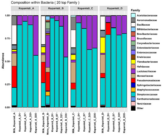 As it was expected, significantly more families were detected in milk samples compared to the Kopanisti cheese samples, as the addition of starters results in a more balanced cheese microbiota (Figure 2) [22,41,42]. The most abundant families detected in milk samples were Streptococcaceae, Pseudomonadaceae, Moraxellaceae, Bacillaceae, Aeromonadaceae and Flavobacteriaceae. Interestingly, the bacteria microbiota of Mana Kopanisti was also highly diverse and more similar to that of milk compared to the Kopanisti cheese samples. On the other hand, no matter the Kopanisti type, Streptococcaceae and Lactobacillaceae were the predominant families identified throughout ripening. However, it should be noted that on Day 1 of Kopanisti D, Pseudomonadaceae was also identified in relatively high abundance. This family seems to have been transferred from the milk to Kopanisti D Day 1 sample but eliminated during ripening, and thus, did not compromise the safety of the final product. Notably, although Pseudomonadaceae was also detected in the other milk samples, the addition of L. lactis and Lc. paracasei as starters in Kopanisti A–C samples inhibited the growth of Pseudomonadaceae.