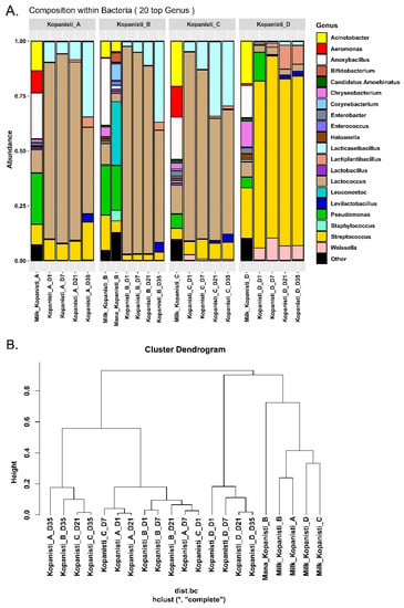 Composition plots of the relative abundances of the 20 most abundant bacteria zOTUs taxonomically assigned at the genus level in pasteurized milk, Mana Kopanisti and Kopanisti cheese samples. Samples from each Kopanisti type (A–D) are presented together in subpanels (A). Hierarchical clustering of the bacteria communities at the genus level identified in pasteurized milk, Mana Kopanisti and Kopanisti cheese samples (B).