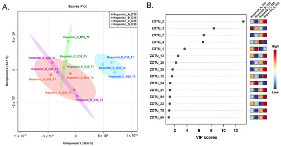 To further explore the degree of diversity among the different Kopanisti types (A–D), a PLS-DA analysis was performed only for the final products (Day 35) using the zOTUs identified in all three trials performed for each Kopanisti type. As shown in Figure 4A, PLS-DA analysis also supported the discrimination of Kopanisti D, as the other three Kopanisti types grouped together, due to the addition of the same starters. This clustering indicates the strong impact of L. lactis and Lc. paracasei to the formation of the bacteria microbiota regardless of the addition of Mana Kopanisti in Kopanisti B or the inclusion of Lig. acidipiscis and Loig. rennini as adjuncts in Kopanisti C. According to the Variable Importance in Projection (VIP) scores, seven zOTUs were considered as highly influential for the clustering resulted by PLS-DA (Figure 4B). In details, zOTU_2 (Streptococcus thermophilus), zOTU_7 (Weissella viridescens), zOTU_13 (Lactiplantibacillus plantarum) and zOTU_20 (Weissella viridescens) were highly associated with Kopanisti D, zOTU_4 (Lacticaseibacillus paracasei) with Kopanisti C, zOTU_1 (Lactococcus lactis) with Kopanisti B and zOTU_3 (Lacticaseibacillus paracasei) with Kopanisti A. VIP scores are in agreement with those by both classical microbiological analysis (Supplementary Table S2A) and compositional analysis (Figure 3A) presented above, as the starters, either L. lactis or Lc. paracasei, seems to influence the microbiota of Kopanisti A–C on Day 35. On the other hand, the zOTUs found to be highly associated with Kopanisti D on Day 35 once again were not the starters, but species originated either from the milk or the environment during cheese making and ripening.
