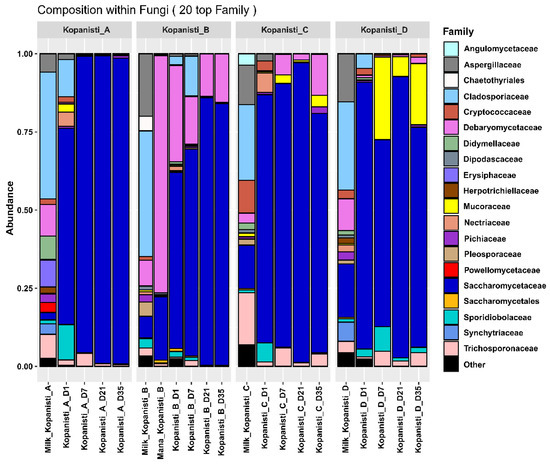 Composition plots of the relative abundances of the 20 most abundant yeasts/fungi zOTUs taxonomically assigned at the family level in pasteurized milk, Mana Kopanisti and Kopanisti cheese samples. Samples from each Kopanisti type (A–D) are presented together in subpanels.