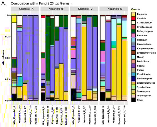 At the genus level, Kluyveromyces, Debaryomyces and Torulaspora were mainly identified in Mana Kopanisti and Kopanisti A–C samples (Figure 6A). Despite the similar genera detected in these samples, their abundances varied based on the sample analyzed; however, the pattern was comparable to that of families. In brief, the microbiota of Kopanisti A samples was more stable than B and C samples, and Mana Kopanisti seems to influence the microbiota of Kopanisti B, although this did not happen in bacteria, as mentioned before. Regarding Kopanisti C, although Kluyveromyces was the main genus detected, on Day 7 Torulaspora prevailed. However, the abundance of Torulaspora significantly decreased from Day 21 until the end of ripening. In contrast to the other Kopanisti types, the microbiota of Kopanisti D was more diverse, as the number of genera detected was much higher. However, from Day 7 the microbiota stabilized, with Torulaspora and Mucor being the main genera identified. The genera detected through metataxonomics analysis were consistent with the results from the classical microbiological analysis (Supplementary Table S2B). In brief, the yeasts isolated from the Kopanisti samples during culture-dependent analysis belonged to the genera Kluyveromyces, Torulaspora, Rhodotorula, Trichosporon, Pichia and Candida, all being among the 20 top genera identified in metataxonomics (Figure 6A).