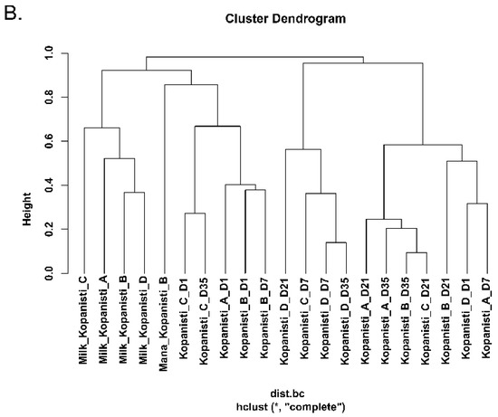 As shown in the hierarchical clustering of the bacteria genera identified in all samples analyzed, two main clusters were formed (Figure 3B). The first consisted of Kopanisti A–C samples and the second of Kopanisti D, Mana Kopanisti and milk samples. This clustering supports the results of both classical microbiological analysis (Supplementary Table S2A) and compositional analysis (Figure 3A) presented above as well as the hypothesis that milk microbiota was shifted to Kopanisti D. The subgroups in the first cluster indicate that neither sample type (Kopanisti A–C) nor sampling point (Day 1–35) were important factors to discriminate the samples. On the contrary, the subgroups formed in the second main cluster revealed that the samples from the same type, i.e., Kopanisti D, Mana Kopanisti and milk, grouped together under the same branch. Specifically, for Kopanisti D, these samples formed three groups with the sample on Day 1 being the most distant due to the presence of the genus Pseudomonas, as mentioned before. Moreover, samples on Days 21 and 35 clustered together due to their similar microbiota (genera identified and relative abundances), indicating that the bacteria microbiota from Day 21 until the end of ripening process was stable without significant differences occurred.