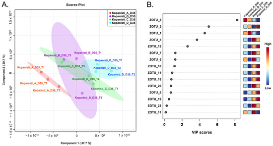 Partial least squares discriminant analysis (PLS-DA) of the bacteria zOTUs detected in the Kopanisti A, B, C and D samples on Day 35. Samples are coloured according to the Kopanisti type, i.e., red for Kopanisti A, purple for Kopanisti B, green for Kopanisti C and blue for Kopanisti D (A). Most influential bacteria zOTUs of the Kopanisti A, B, C and D samples on Day 35 were based on the Variable Importance in Projection (VIP) scores from the PLS-DA. The colour bar indicates the intensity of the variable in the respective Kopanisti type (B).