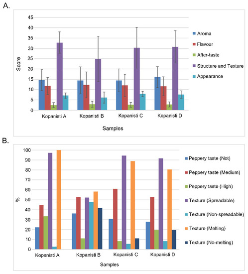 Graphical representation of sensory evaluation of Kopanisti A, B, C and D cheese samples on Day 35 regarding (A) aroma, flavour, after-taste, structure and texture and appearance, and (B) peppery taste (not/medium/high), texture (spreadable/non-spreadable) and texture (melting/no-melting). Statistically significant differences (p < 0.05) were detected between Kopanisti A and B, Kopanisti B and C, and Kopanisti B and D for structure and texture, and between Kopanisti B and C, and Kopanisti B and D for appearance.