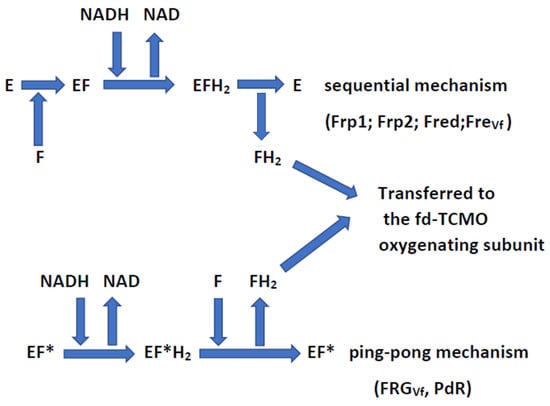 Historically, the isoenzymic enantiocomplementary diketocamphane monooxygenases (DKCMOs) from the (rac)-camphor-degrading bacterium Pseudomonas putida ATCC 17453 [] and the LuxAB luciferase from the bioluminescent marine bacterium Vibrio fischeri ATCC 7744 [], along with a small number of other known enzymes, were first grouped together on shared functional properties as NADH + FMN-dependent Type 2 Baeyer–Villiger monooxygenases (BVMOs) to distinguish them from the NADPH + FAD-dependent Type 1 BVMOs []. While the much more prevalent Type 1 BVMOs have always been recognised as single component true flavoprotein enzymes replete with an active site-bound FAD coenzyme [], it is now acknowledged that the DKCMOs (2,5-DKCMO [EC 1.14.14.108] and 3,6-DKCMO [EC 1.14.14.155]), and LuxAB luciferase (EC 1.14.14.3) are structurally different, being archetypal members of the recently delineated FMN-dependent two-component monooxygenases (fd-TCMOs, []). The defining feature of the fd-TCMOs that excludes them from being classed as true flavoproteins is that they are dependent on deploying fully reduced FMN (FMNH2) as a cosubstrate rather than as an active site-bound coenzyme. Significantly, the FMNH2 cosubstrate is acquired from one or more distal flavin reductases (FRs [EC 1.5.1.x]). FRs are widely distributed enzymes, a number of which have been purified from various bacteria: the nomenclature and characteristics of some well-studied prokaryotic FRs confirmed to fully reduce FMN effectively are summarised in Table 1. Because reduced flavins can react both directly and indirectly with molecular oxygen to generate highly reactive oxygen species (ROS) that are capable of destroying DNA, lipids, and proteins [,,,], the mode of functioning of the fd-TCMOs poses a considerable challenge to aerobic organisms that consequently requires a close logistical relationship between the two participating activities [].